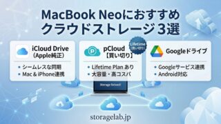 今回は、MacBook Neoにおすすすめなクラウドストレージサービスを3つ紹介します。結論 とにかく便利にデータ同期したい方は、iCloudがおすすめ。ただ、基本はデータ同期なので、MacBook Neoの容量で足りない人は要注意。 大容...