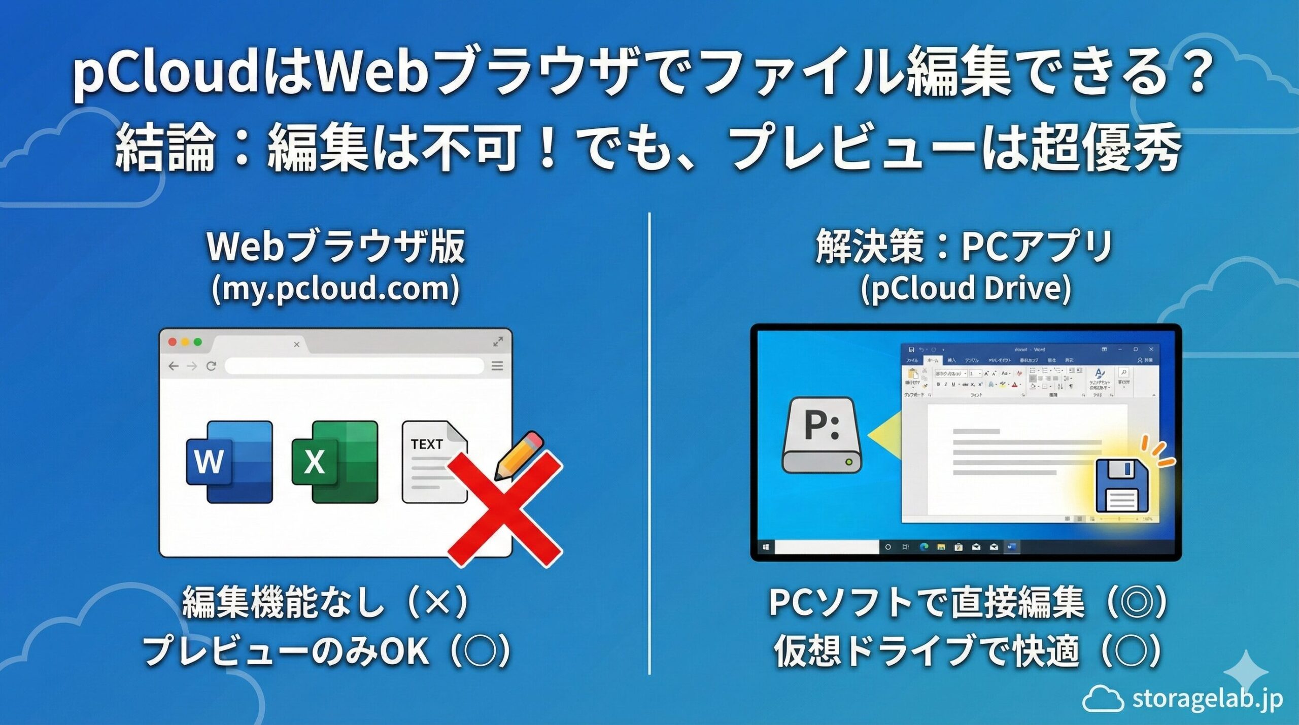 Google DriveやOneDriveでは、Webブラウザ上でWordやExcel、テキストファイルなどを直接編集できるのが一般的ですが、pCloudの仕様について詳しく解説します。