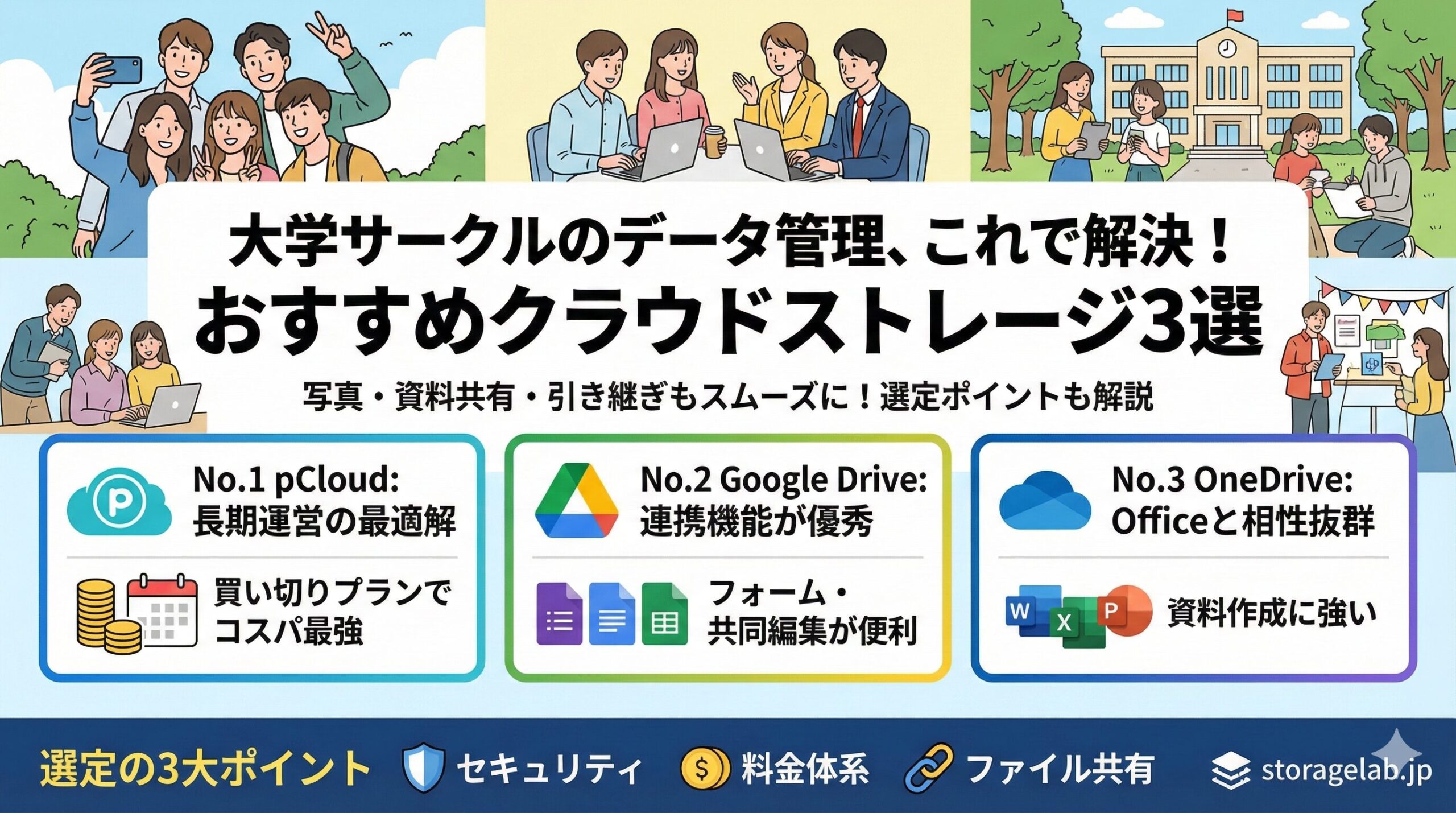 今回は、大学のサークル運営において導入をおすすめするクラウドストレージサービスを3つ紹介します。それぞれの特徴を比較し、自分たちのサークルに合ったものを選んでみてください。