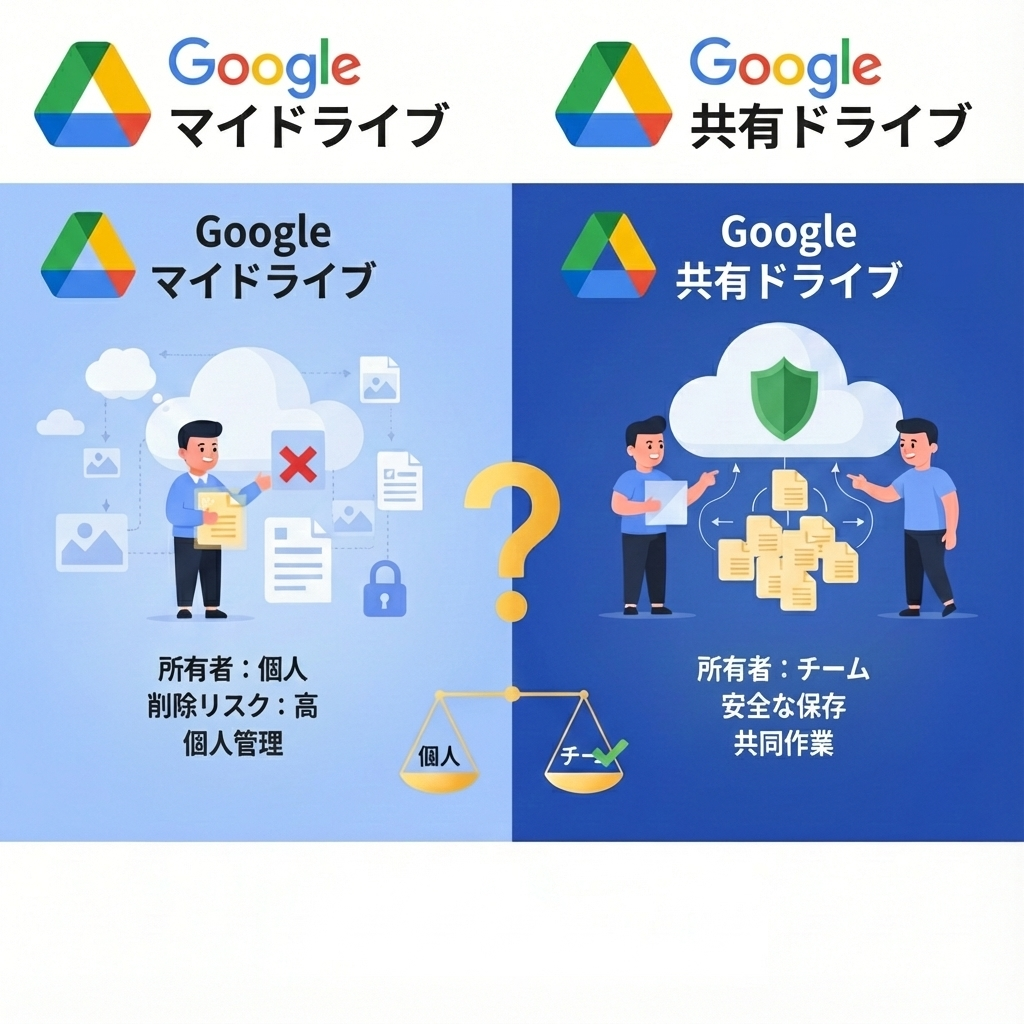 Googleドライブの共有ドライブとマイドライブの違いを初心者向けに解説。所有者や削除リスク、使い分けのポイントがわかります。