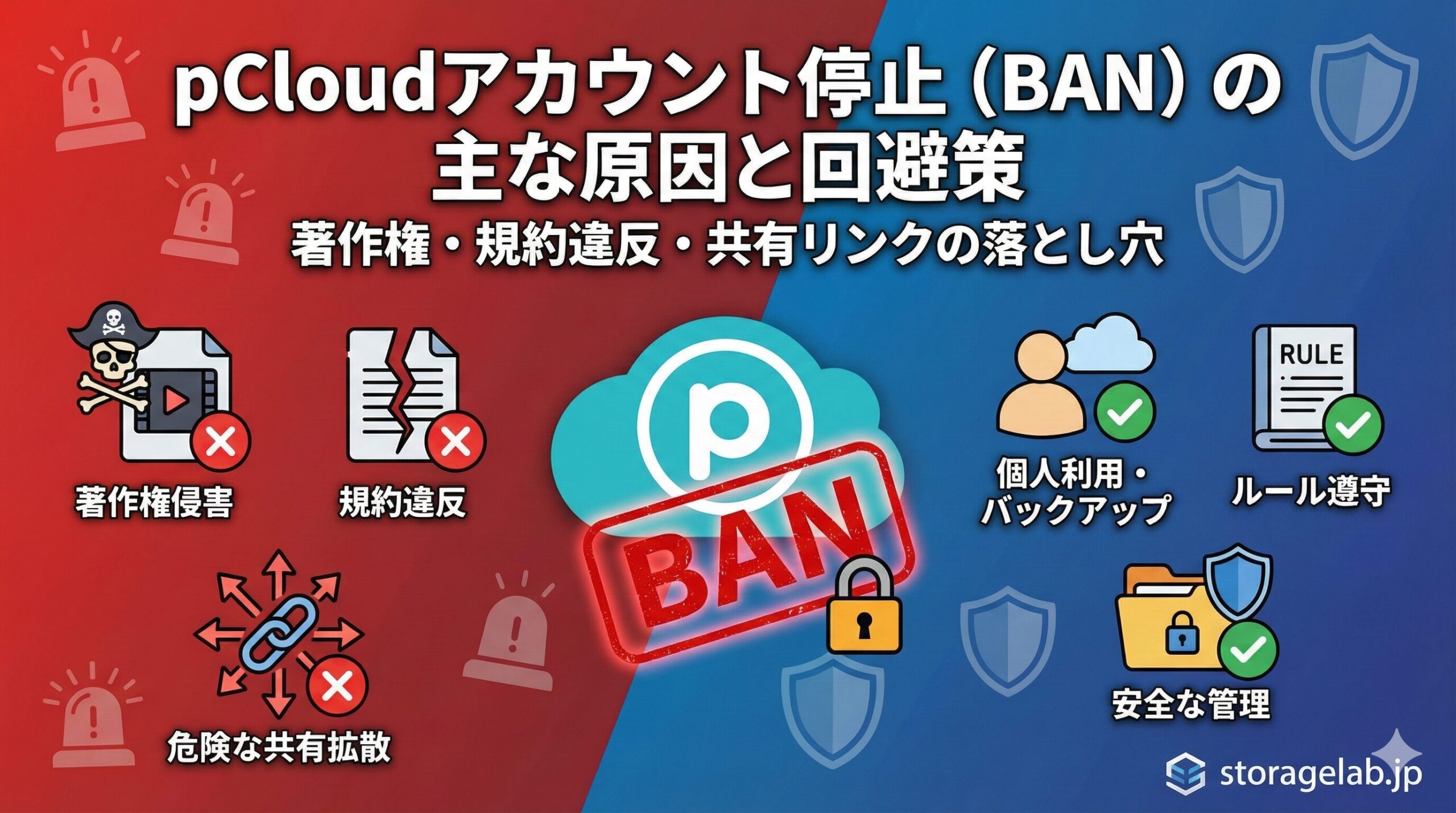 - pCloudのBANは通常利用では起きにくく、主な原因は著作権侵害・規約違反・共有リンクの不適切な使い方である