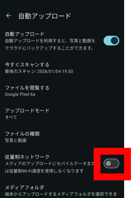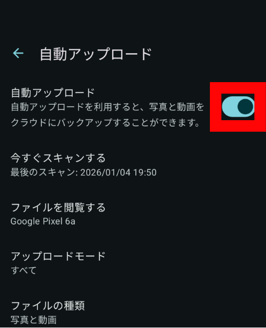 自動アップロードを一時的に停止したい場合や、モバイルデータ通信量を節約したい場合は、同じ手順でスイッチをオフにするだけです。