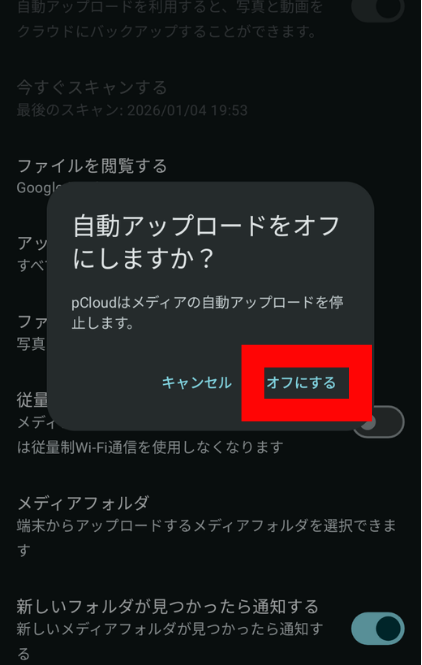 「自動アップロードをオフにしますか?」と出ますので、「オフにする」をタップします。