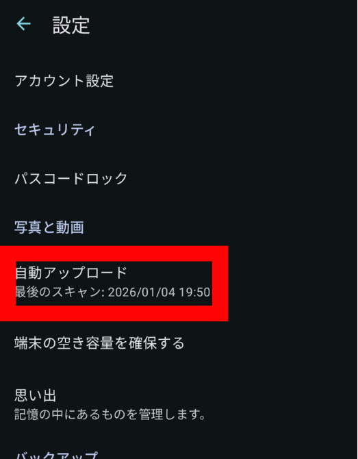自動アップロードをオンにする手順を画像で解説します。
