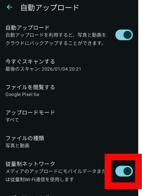 モバイルデータ通信量を節約したい場合は、Wi-Fi接続時のみ自動アップロードする設定がおすすめです。