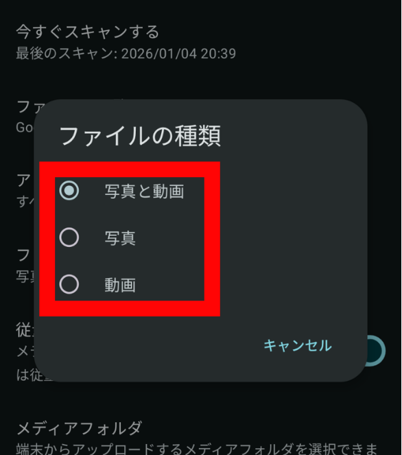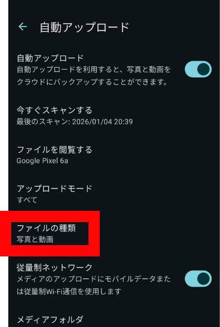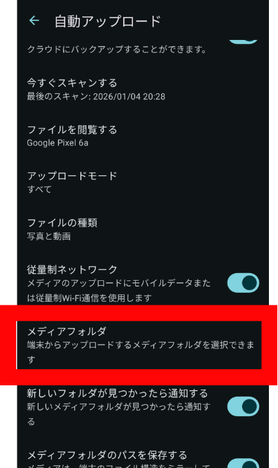 - アップロードするフォルダの選択(カメラ、スクリーンショット、ダウンロードなど)