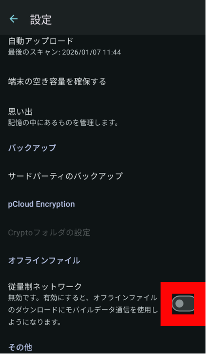pCloudの一部設定では、特定のフォルダが自動的にオフライン保存される設定になっていることがあります。