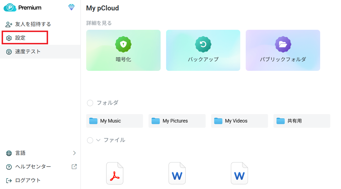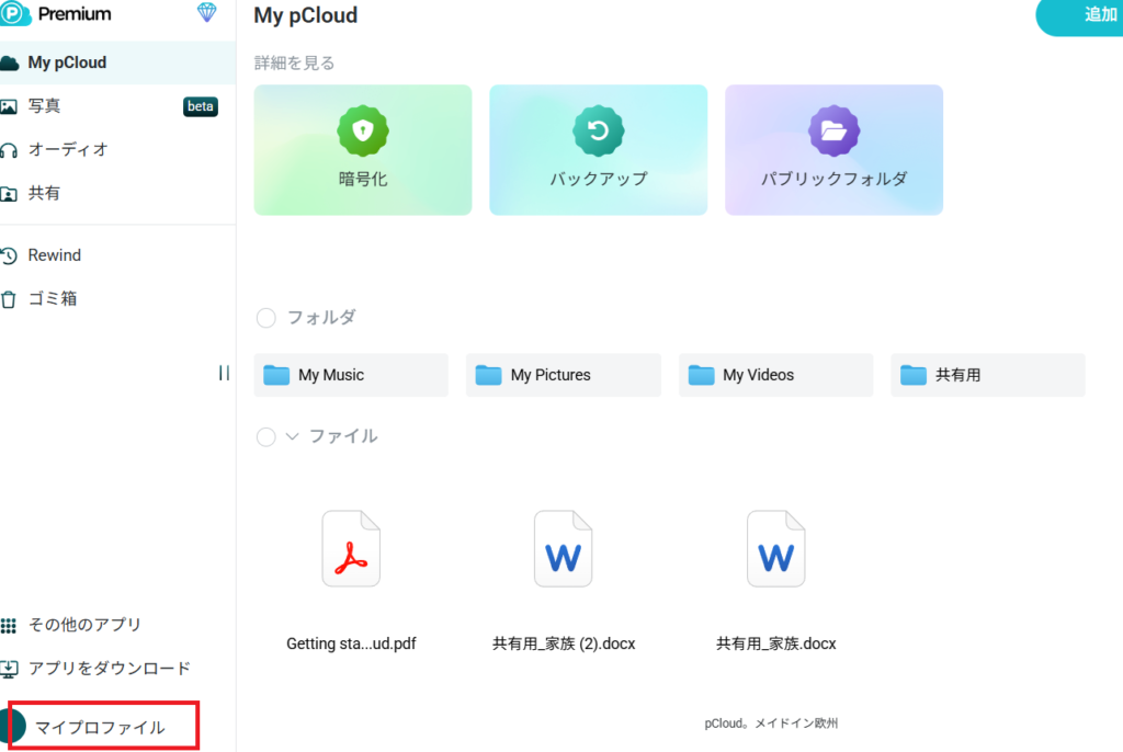 まず、pCloud Web版にアクセスして、左下の「マイプロファイル」をクリックします。