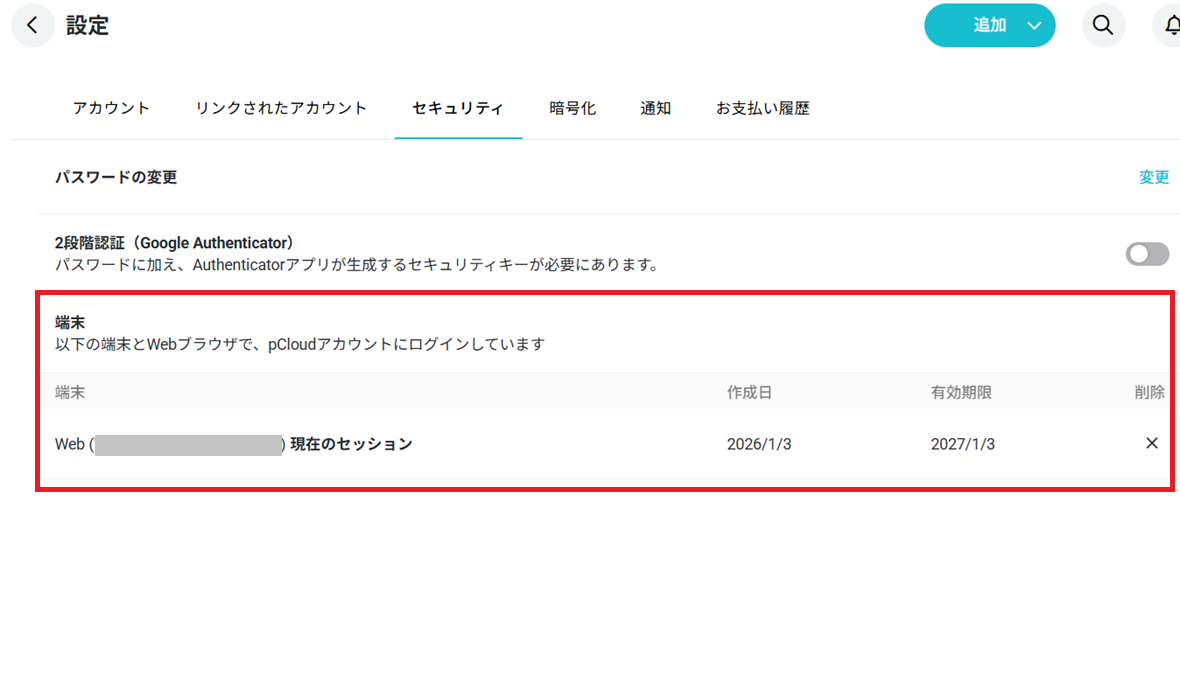 共有リンクの設定だけではなく、自分自身のpCloudアカウント自体が、不正ログインされていないかを定期的にチェックすることも大切です。pCloudでは、不審な端末からのログインがないかを管理することができます。