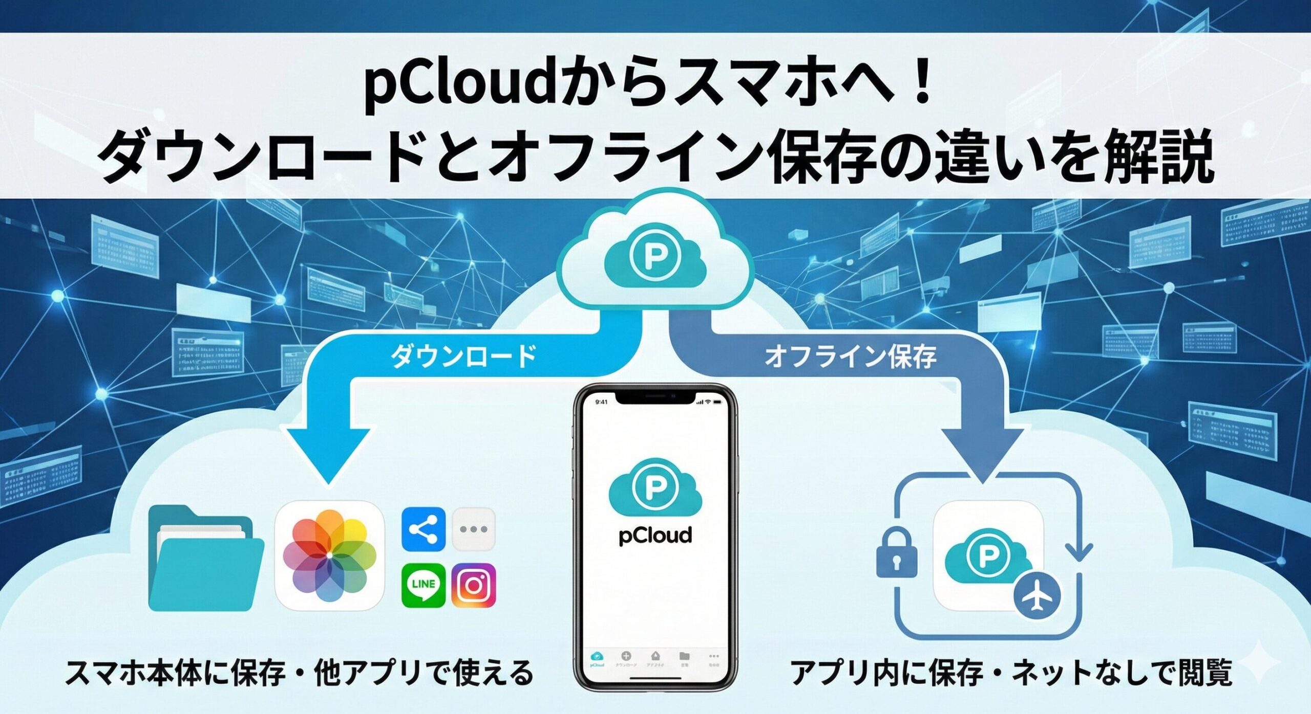 pCloudには「ダウンロード」と「オフライン保存」という2つの保存方法があり、それぞれ保存先や用途が異なります。