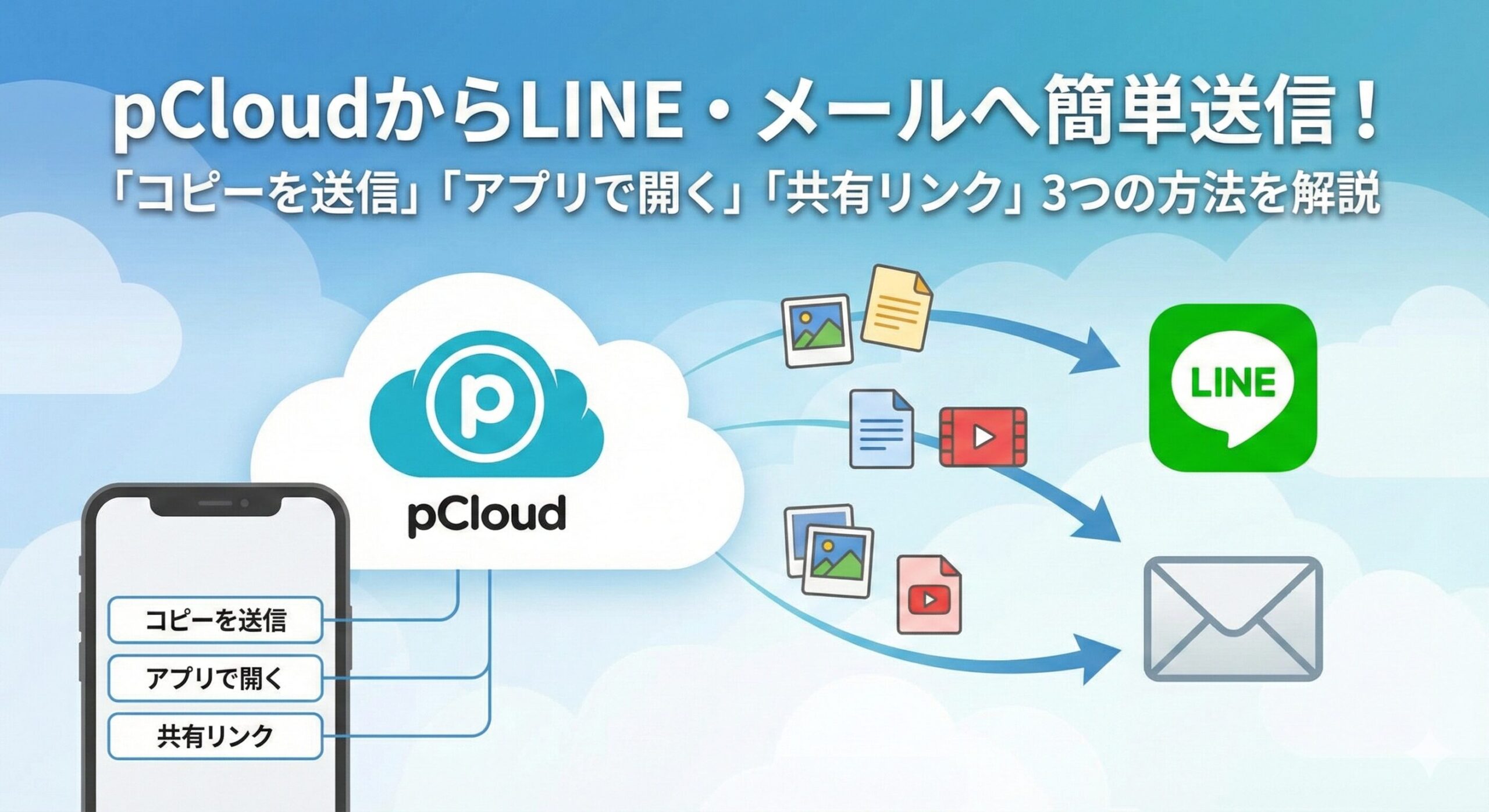 pCloudのファイルをLINEやメールで送るには、「コピーを送信」「アプリで開く」「共有リンク」の3つの方法があります。用途に応じて使い分けることで、効率的にファイルを共有できます。