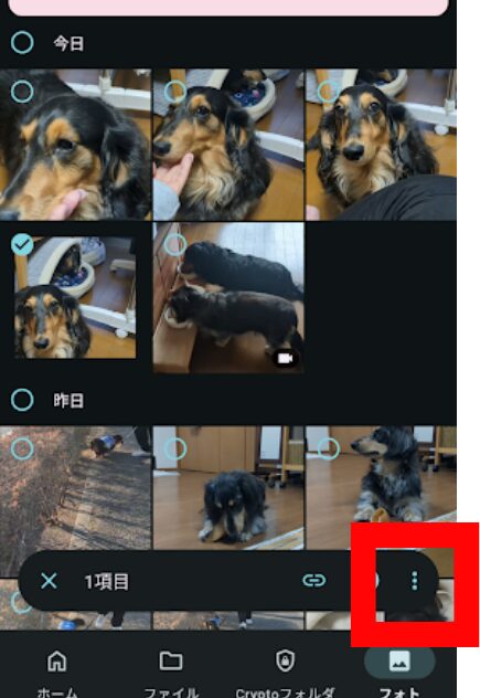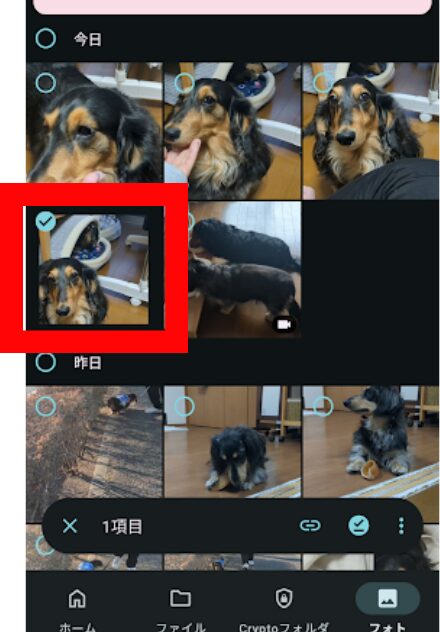 1.pCloudアプリを開き、送りたいファイル(写真など)を長押しし選択します。