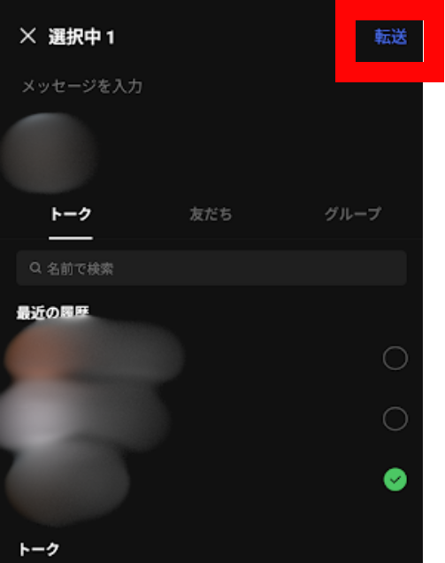 7.「〇〇に転送しました」と出て、トーク画面に表示されます。