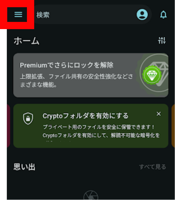 1..pCloudアプリを開き、左上の「三」をタップします。