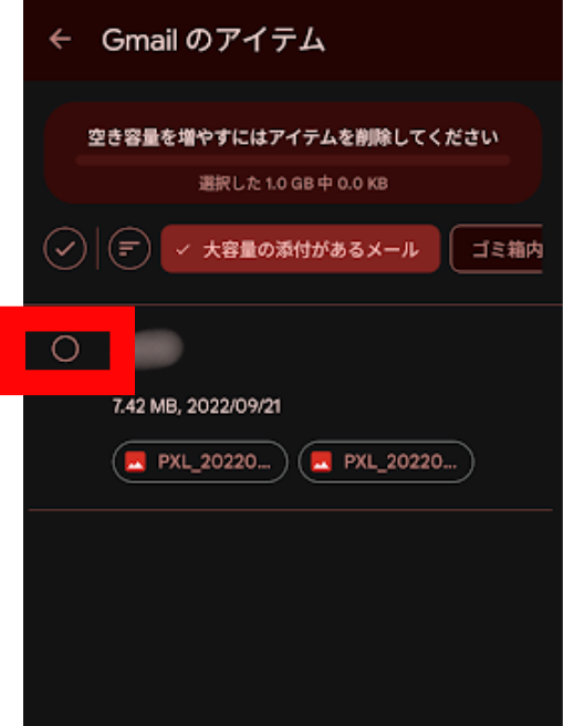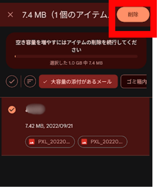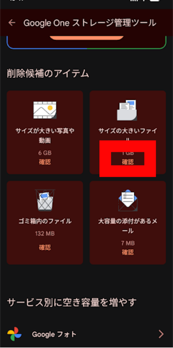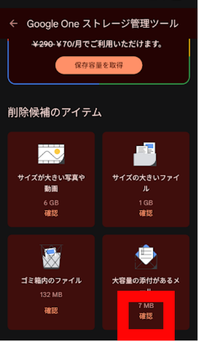 5.ストレージ管理で、「削除候補のアイテム」から大容量の添付があるメールの下の「確認」をタップします。