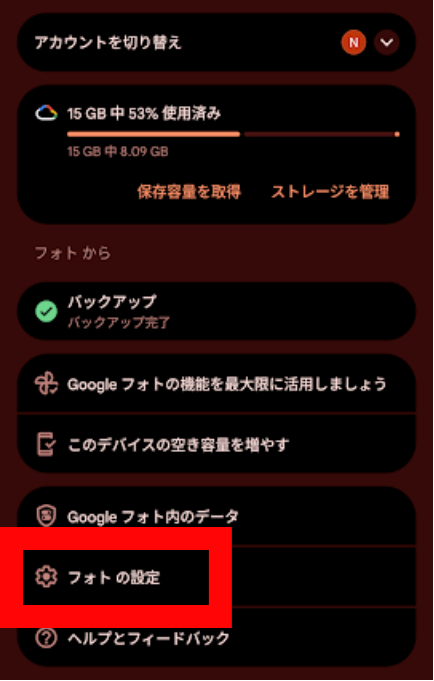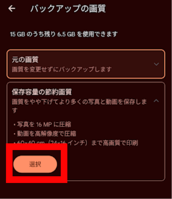 Googleフォトの自動バックアップを「保存容量の節約画質」に設定してください(前述)。