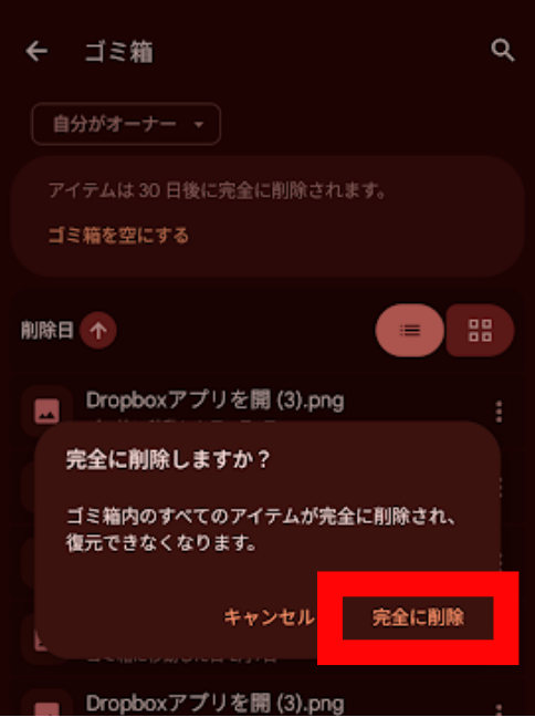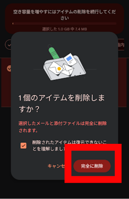 8.確認メッセージが表示されるので「完全に削除」をタップします。