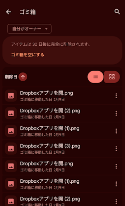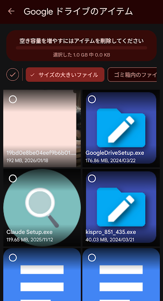 • ウェブブラウザで大きいファイルを検索すると効率的: Androidアプリにはファイルサイズで検索する機能がないため、容量を効率的に削減したい場合は、ウェブブラウザ(drive.google.com)を使ってください。検索フィルターで「10MB以上」などの条件を指定したり、リスト表示でサイズ順に並べ替えたりできます。動画ファイルは特に容量を消費するため、type:video と検索して大きな動画から削除するのが効果的です