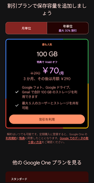 無料の15GBでは足りない場合、Google Oneで容量を追加購入できます。