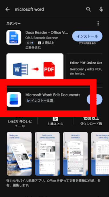 - Microsoft WordアプリとExcelアプリをGoogle Playストアからインストールする
