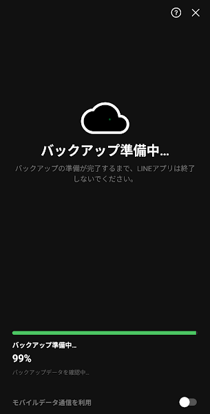 初回の場合はパスワードの入力を求められる場合があるため入力し、画面にそって進むことでバックアップが開始されます。データ量によっては数分かかる場合があります。完了するまでLINEアプリを閉じずに待ちましょう。