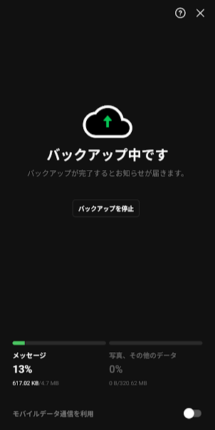 注意:バックアップ中はWi-Fiに接続した状態で行うことをおすすめします。モバイルデータでも実行できますが、大量のデータがある場合は通信量を多く消費します。