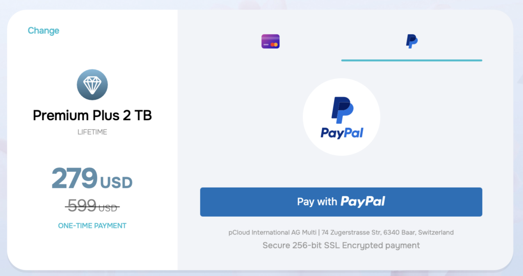 pCloudはスイスの企業によるサービスですので、一般的な日本企業のサービスでよくみられる振込用紙や銀行振込、コンビニ決済などは一切使うことができません。また、支払いも基本的にドル建て決済です。