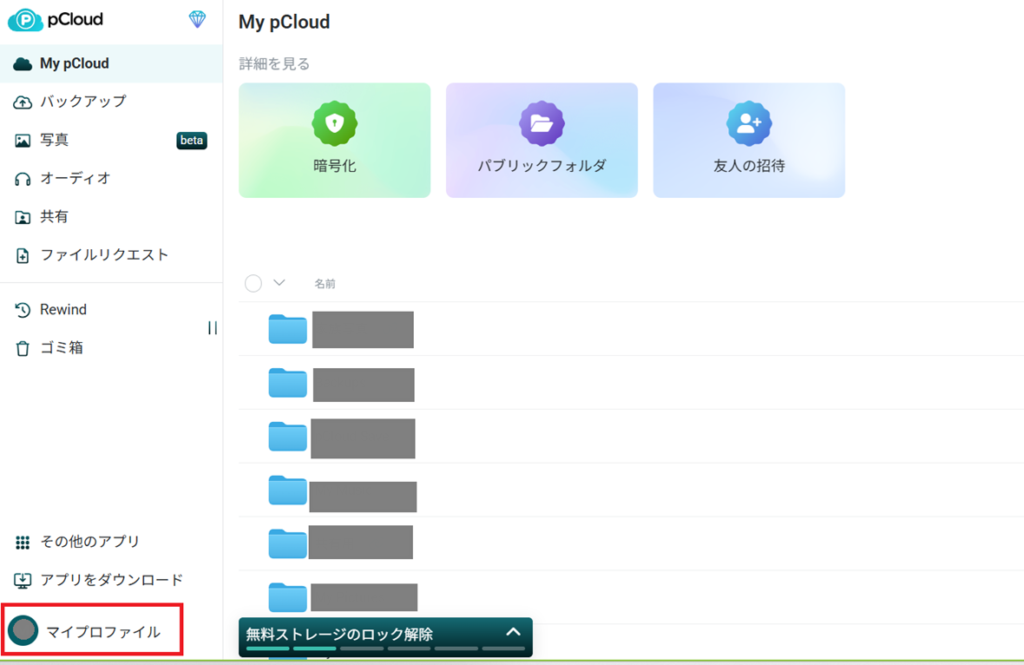 なお、マイアカウントページ(ストレージ管理画面)の場合は、左下にある「マイプロファイル」を押すと、「Premiumにアップグレード」ボタンがあるので、そこをクリックします。