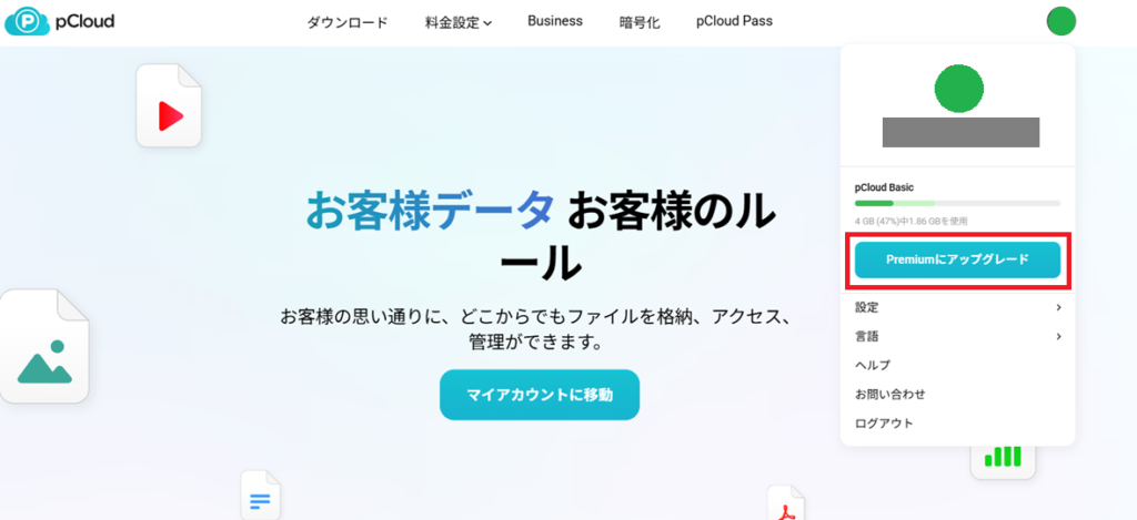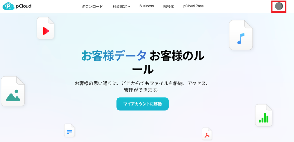 まずはpCloudにアクセスします。ログインした後、画面右上にあるアイコンをクリックします。