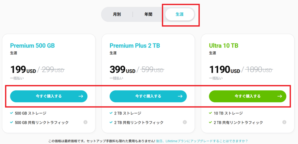 プランの選択画面になります。「生涯」と書かれているタブを選択している場合は、買い切りプランを参照している状態ですので、そのまま下に表示されているプランから好きなものを選びます。もしも「月額」「年額」と書かれているタブになっている場合は、サブスクリプション(定額制)タイプの契約になってしまうので、切り替えましょう。プランを検討したら、そのプランの「購入する」をクリックします。