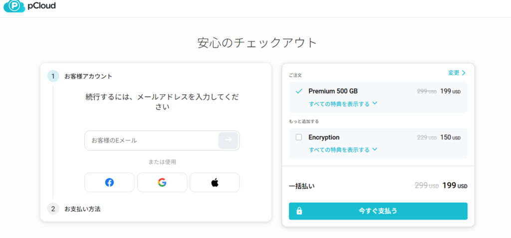 ていない方は、以下のリンクからpCloudの契約を行うページに行ってください。なお、pCloudはセールを行なっていることもあるので、購入の際には必ず以下の記事のセール情報を確認した上で、登録や購入をすることをおすすめします。