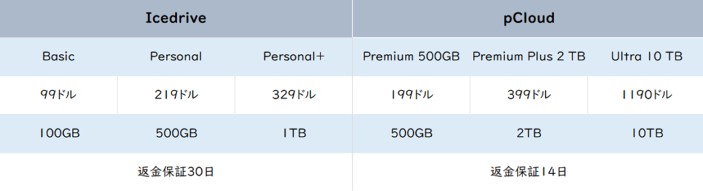 pCloudとIcedriveの買い切りプランについて、表にまとめてみました。(※情報は2026年3月時点のものです)