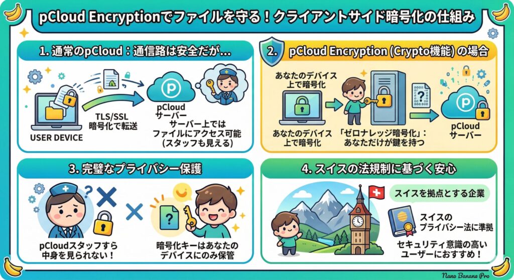 pCloud Encryptionとは、pCloudのストレージに保存するファイルをクライアントサイドで暗号化するオプション機能です。通常のpCloudは転送時にTLS/SSL暗号化が適用されますが、サーバー上のファイルはpCloud側でアクセス可能な状態にあります。 これに対してEncryption(Crypto機能)を使うと、ファイルはあなたのデバイス上で暗号化されてからアップロードされるため、pCloudのスタッフすら中身を見ることができません。