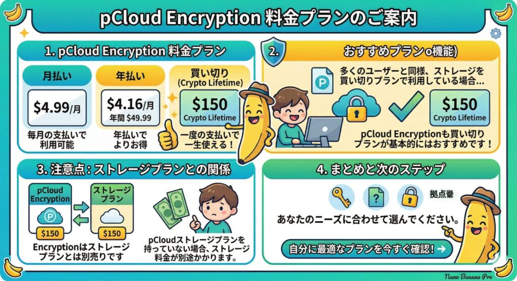 重要な注意点として、pCloud EncryptionはストレージプランなしでEncryptionのみを購入することはできません。つまり「Encryptionだけセールで安く買う」という選択肢は基本的に存在しません。