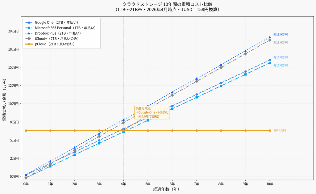 pCloudの買い切りプランは初年度こそ費用が高いものの、4年目に入る頃には累計コストでGoogle One・Microsoft 365を逆転します。 5年後にはDropbox・iCloudより約31,000円も安くなる計算です。さらに6年目以降はpCloudの追加費用はゼロなので、差はどんどん広がっていきます。 さらに10年間利用した場合についても、試算してみました。表だけだとわかりづらいので、グラフで示しています。 オレンジ色がpCloud の買い切りプランですが、他のクラウドストレージと比べると圧倒的なコスパの良さです。だいたい、4年程度で他のクラウドストレージサービスと一緒になり、それ以降はどんどん金額が開いていき、10年利用時点では、他のクラウドストレージサービスと比較して約10万円分も得している計算になります。