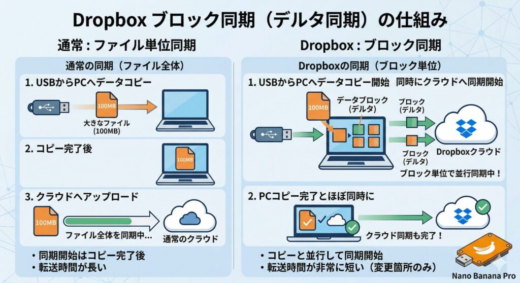 ファイル同期の速さと安定性はトップクラスで、チームでの共同作業に向いています。ただし価格が最も高く、容量当たりのコストパフォーマンスは低めです。 Dropboxでは、「ブロック同期(デルタ同期)」と呼ばれるデータの同期機能が搭載されています。通常のクラウドストレージは、ファイル単位で同期を行います。そのため、例えば、USBやSDカードからPCにデータをコピーした際に、クラウドストレージ側に同期されるのはあくまでもコピーが終わったタイミングとなります。一方で、Dropboxの「ブロック同期(デルタ同期)」では、コピーが始まったと同時にどんどんクラウド側にもアップロードが走ります。 そのため、大容量のデータを扱いながら時間との戦いが多い、YouTuberなどの多くのクリエイターはDropboxを好んで利用しています。 一方で、ビジネス用途や特定のコラボレーションツールとの統合が必要でない限り、個人ユーザーにとって若干割高に感じることが多いです。