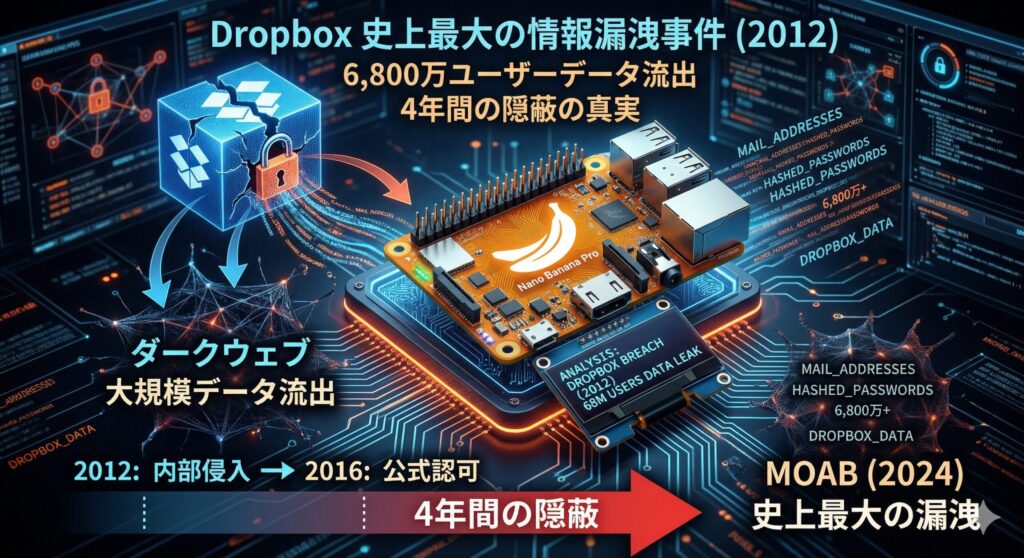 この侵入によって、6,800万以上のユーザーのメールアドレスとハッシュ化されたパスワードが盗まれました。Dropboxがこの事実を公式に認めたのは2016年、実に4年後のことでした。2024年には「史上最大の情報漏洩(MOAB)」として知られるダークウェブへの大規模データ公開の中に、この2012年のDropboxデータも含まれていたことが確認されています。