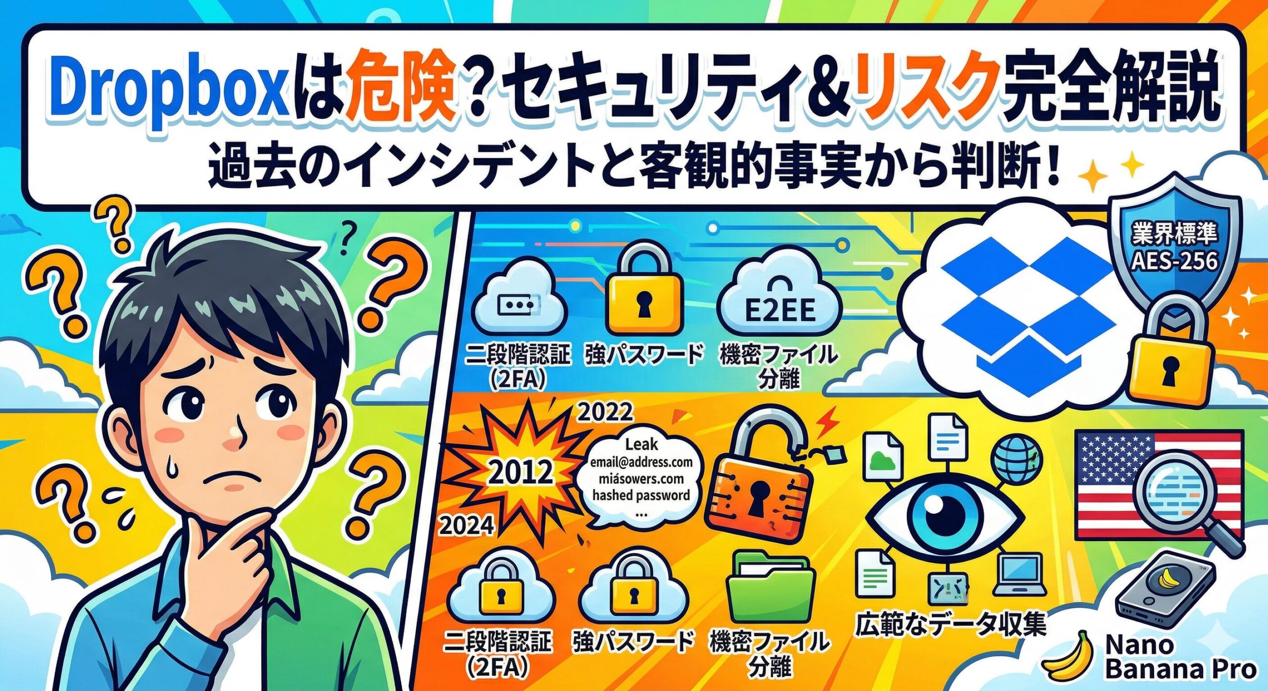 結論から言うと、Dropboxは一般的な用途では十分使えるサービスです。ただし「危険性がゼロ」とは言い切れない理由がいくつかあります。この記事では、Dropbox特有のリスクと、安全に使うための対策を整理します。