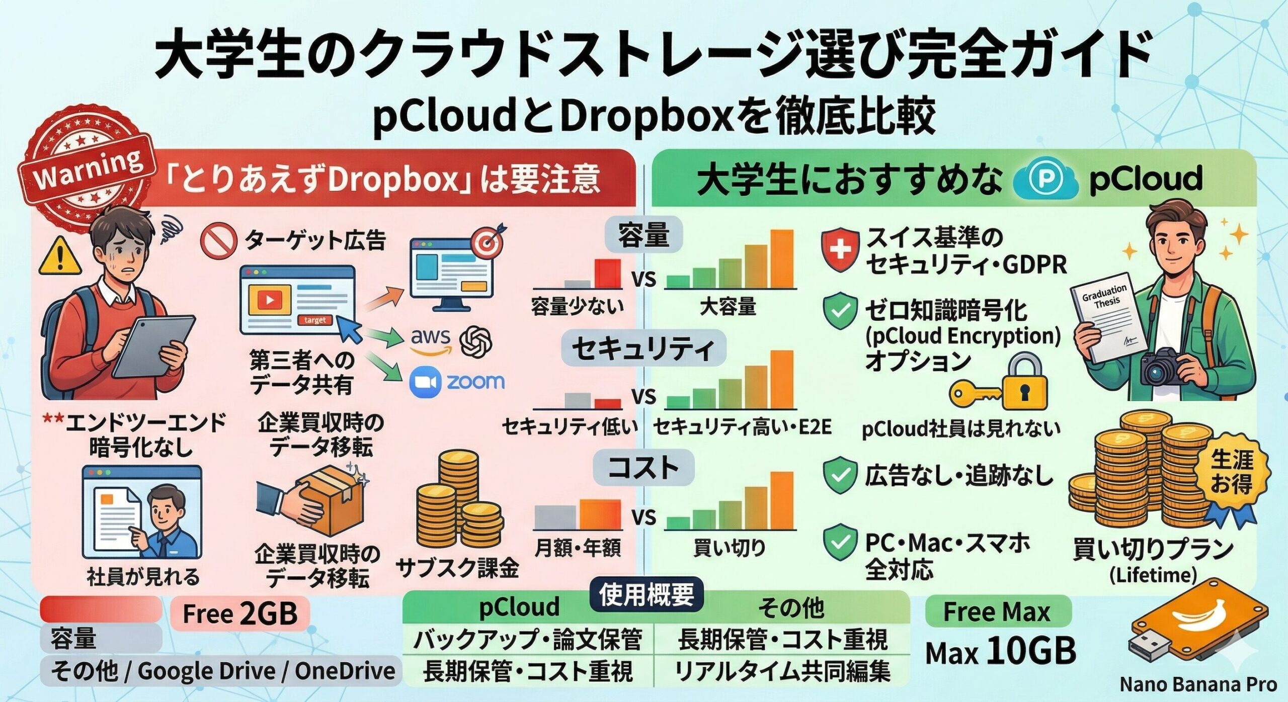 大学生活の4年間(以上)を通じて使い続けるクラウドストレージは、使いやすさだけでなくプライバシーとコストの両面から選ぶことが大切です。