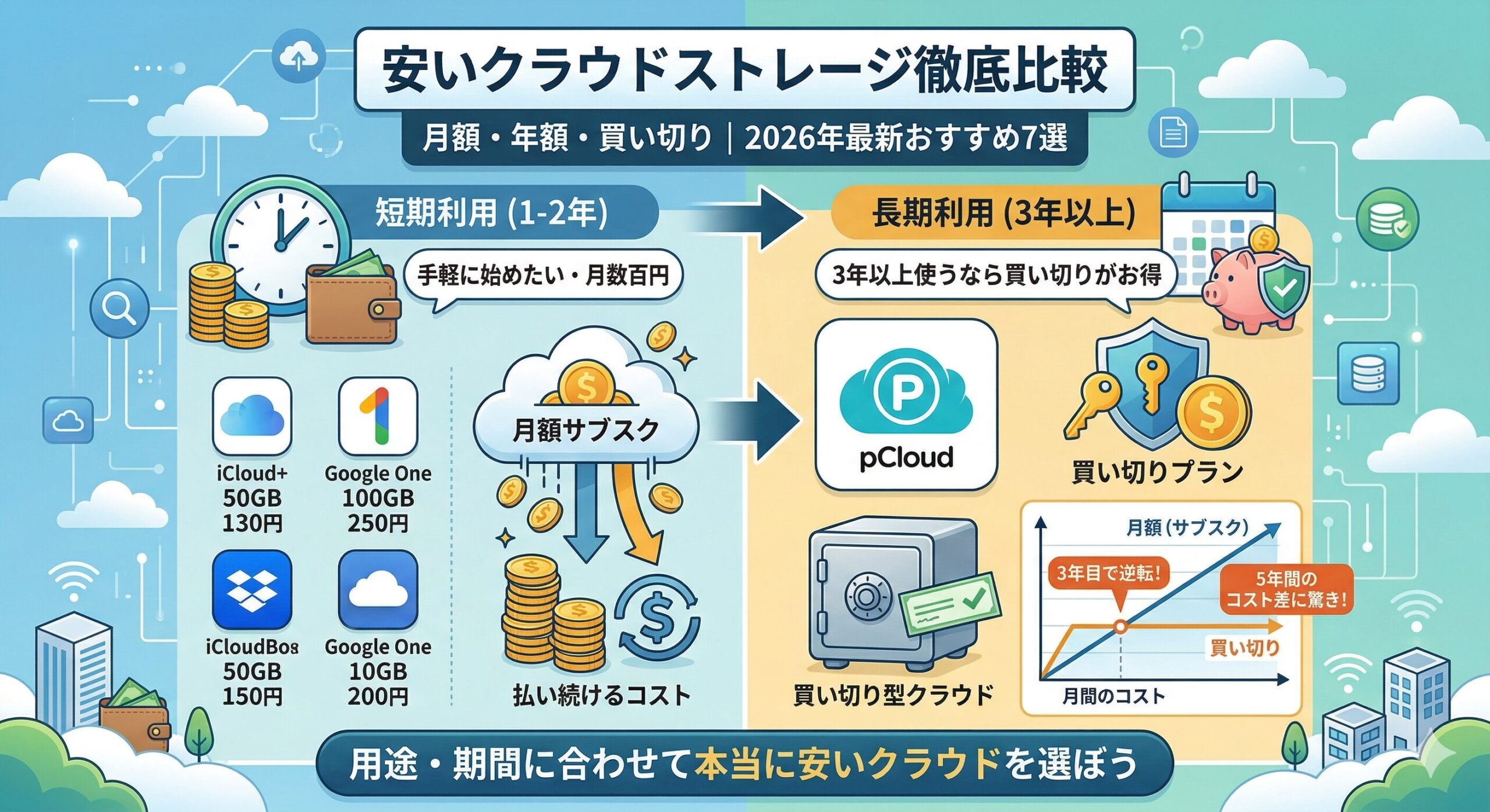 「何を安いと定義するか」によります。月額で最安なのはiCloud+ 50GB(月130円)です。長期コストで最安なのはpCloudの買い切りプランで、3〜4年以上使うと月額課金のどのサービスよりも安くなります。