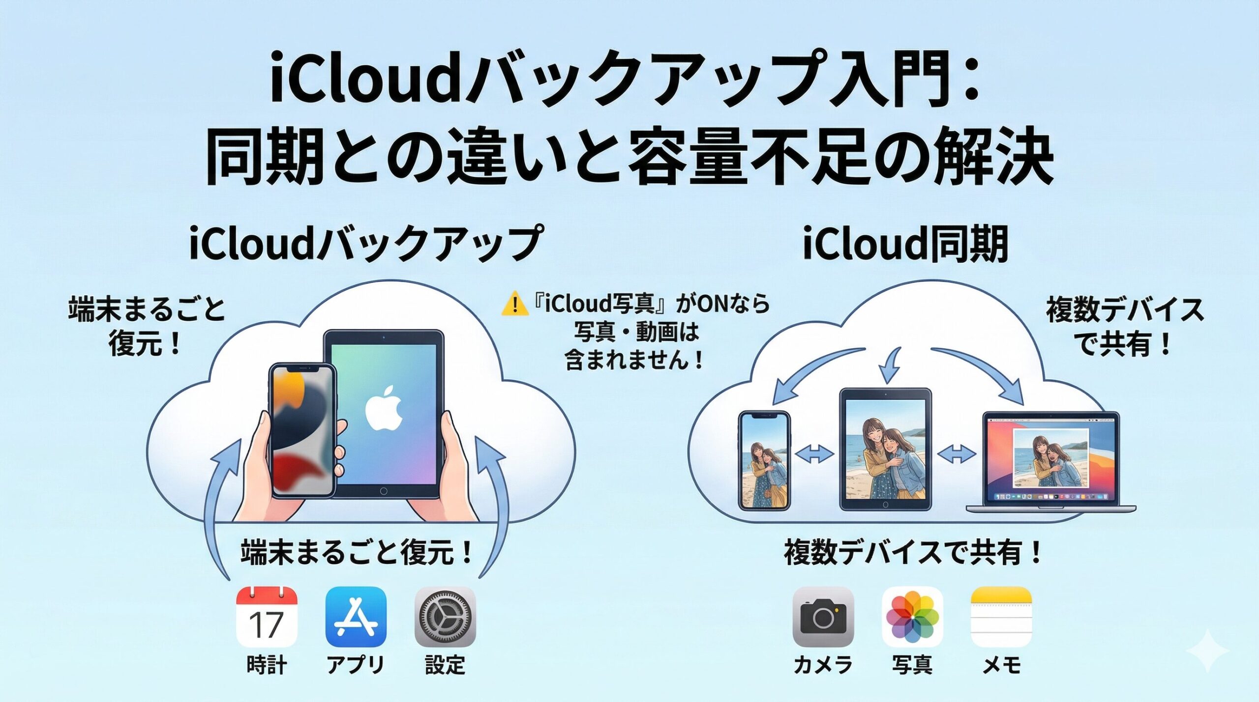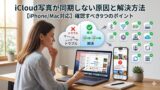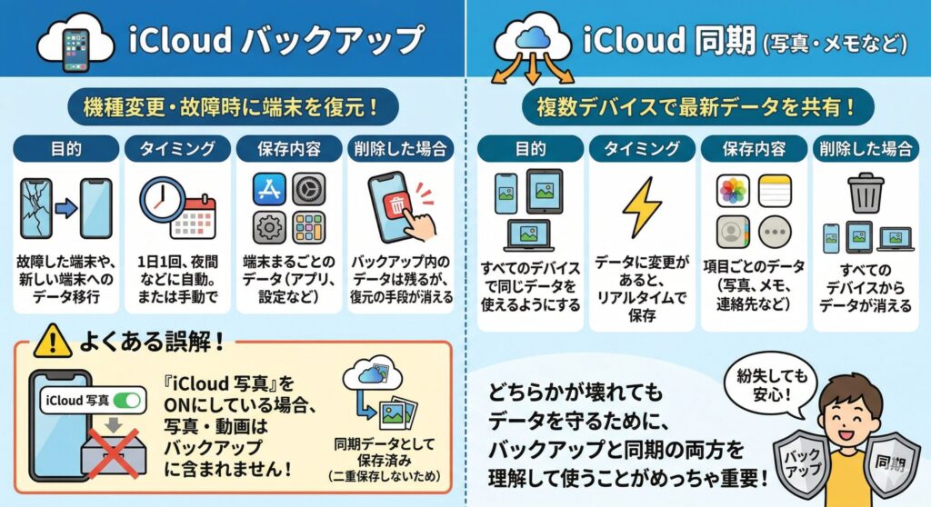 「iCloudを使っているから大丈夫」と思っている方も多いのですが、iCloudバックアップとiCloudの同期(iCloud写真・iCloudドライブなど)は全くの別機能です。この違いを理解していないと、「バックアップしていたはずなのに復元できなかった」というトラブルに繋がります。