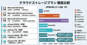 | Microsoft 365 Personal | 1TB | 21,300円 | 106,500円 | Office+Copilot込み |