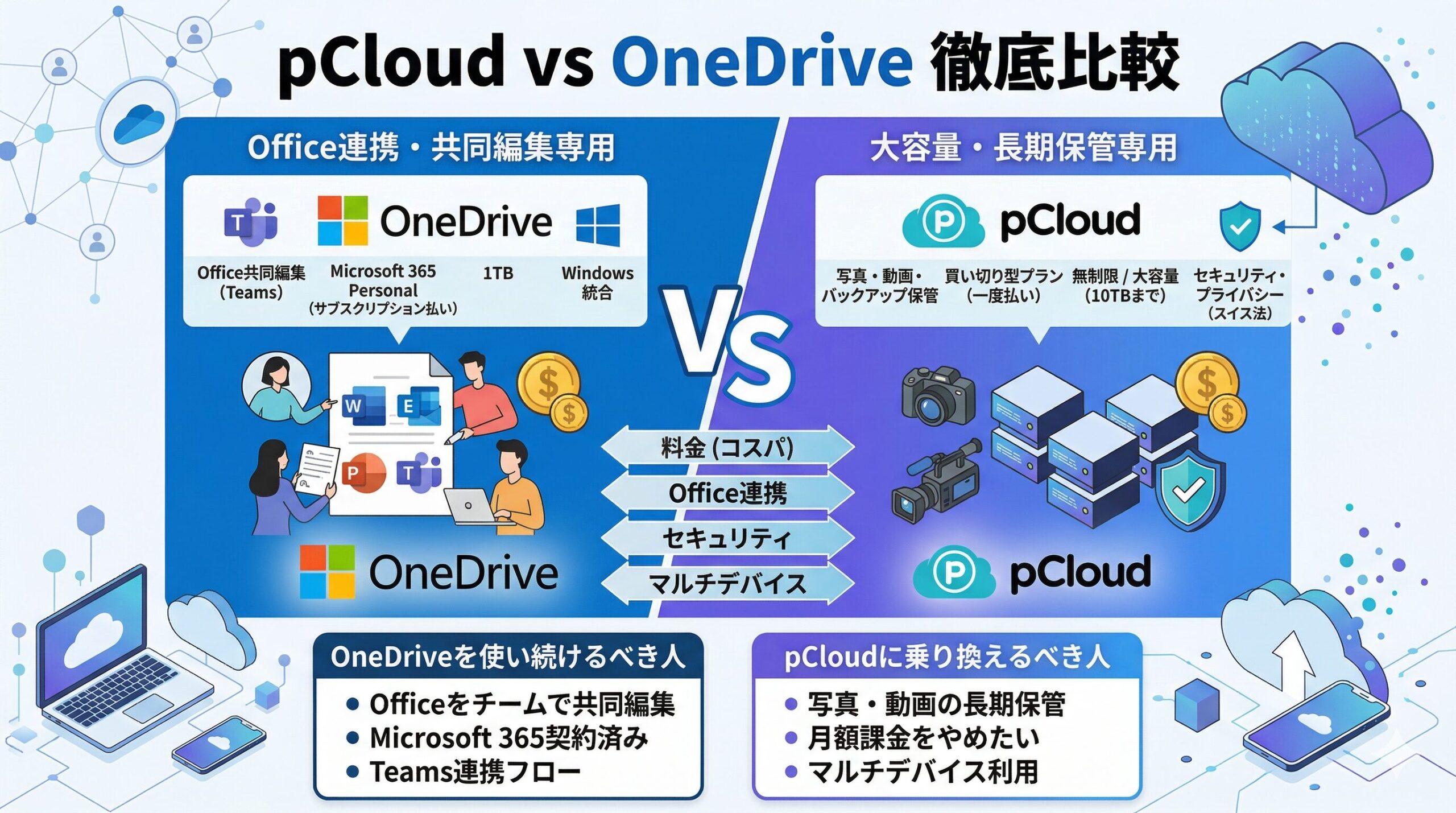 Office共同編集が必要な場合はYESです。ただし写真・動画の保管・個人ファイルのバックアップが主な目的なら、pCloudの方が容量・コスト・速度すべての面で優れています。