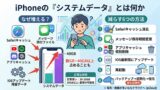 また、iPhoneは使っていくうちにどんどんシステムデータが溜まってしまっていくという課題もあります。iPhoneのシステムデータとは何か?多すぎる原因と減らし方を完全解説【iOS 18対応】