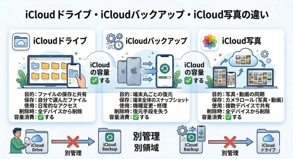 iCloudドライブ・iCloudバックアップ・iCloud写真の違い