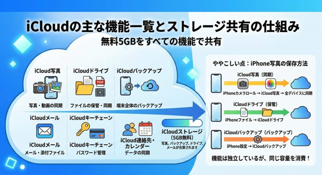 iCloudはAppleが提供するクラウドサービスの総称です。その中には複数の機能が含まれています。