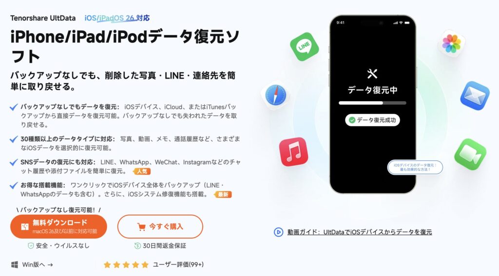 公式の手段で復元できなかった場合、有料のデータ復元ソフト(Tenorshare UltDataなど)を使う方法もありますが、確実性は高くなく、費用もかかります。
