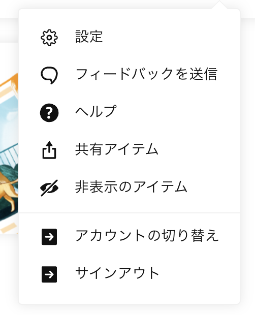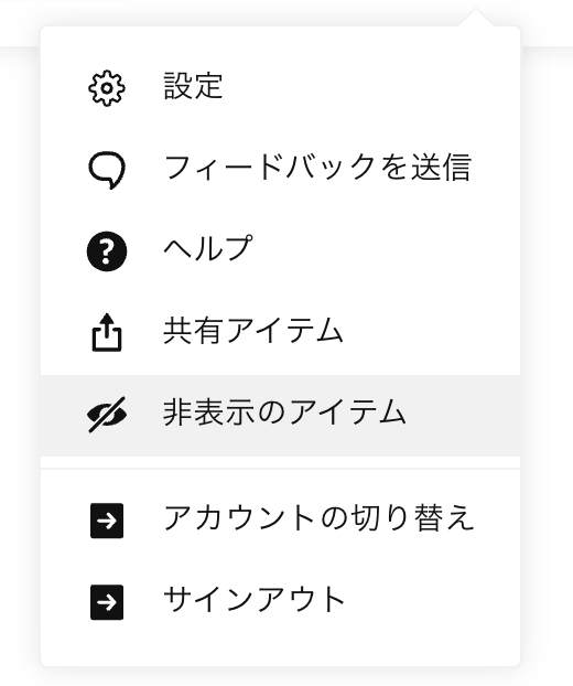 右上のご自身の名前をクリックしていただき「非表示のアイテム」を選択することで非表示になっている写真を確認できます。