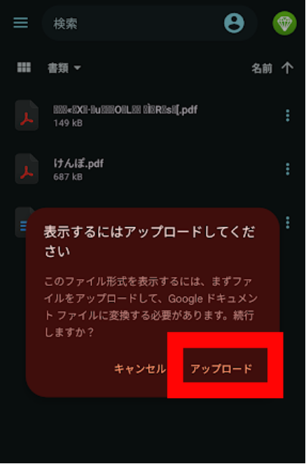 6.アップロードの案内表示が出るので「アップロード」をタップします。
