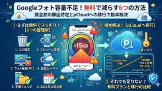 Googleフォト Googleフォトの容量がいっぱいになったら?無料で解決する6つの方法と写真を守る移行術【2026年】 この記事でわかること Googleフォトの容量が何でいっぱいになっているか確認する方法 お金をかけずに今すぐ容量を空ける6つの方法(手順付き) 「削除したのに容量が減らない」原因と対処法 Googleフォトの容量を根本的に解決する写真の移行... 2026.04.08 Googleフォト